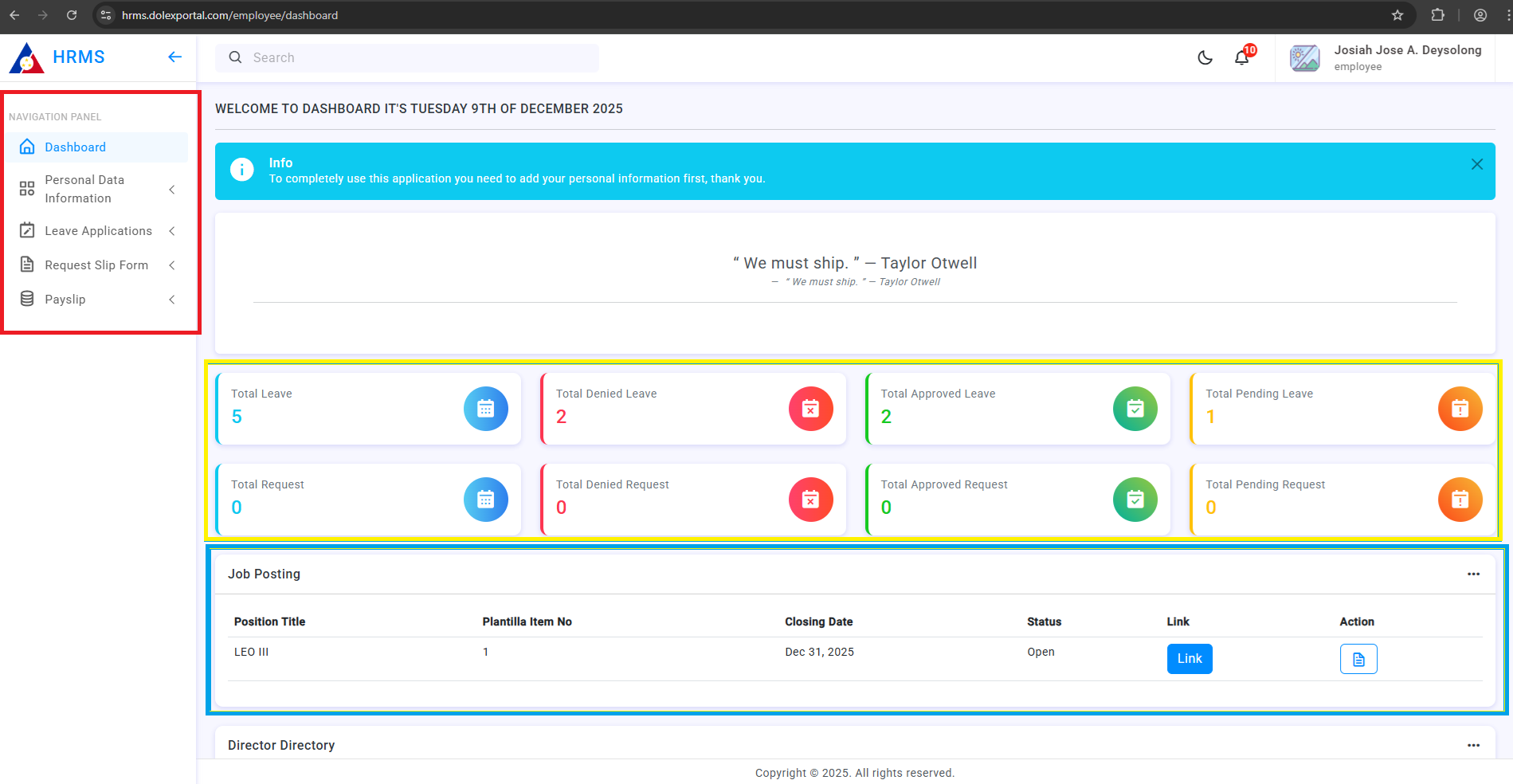 Section highlighted with blue table displays the current job vacancies of the Regional Office, this is updated regularly by the HR unit. Section highlighted with yellow show the data such as Leave applications and Request applications filed by the employee. Section highlighted with red displays the navigation dock of the system. In the navigation dock section is grouped by: